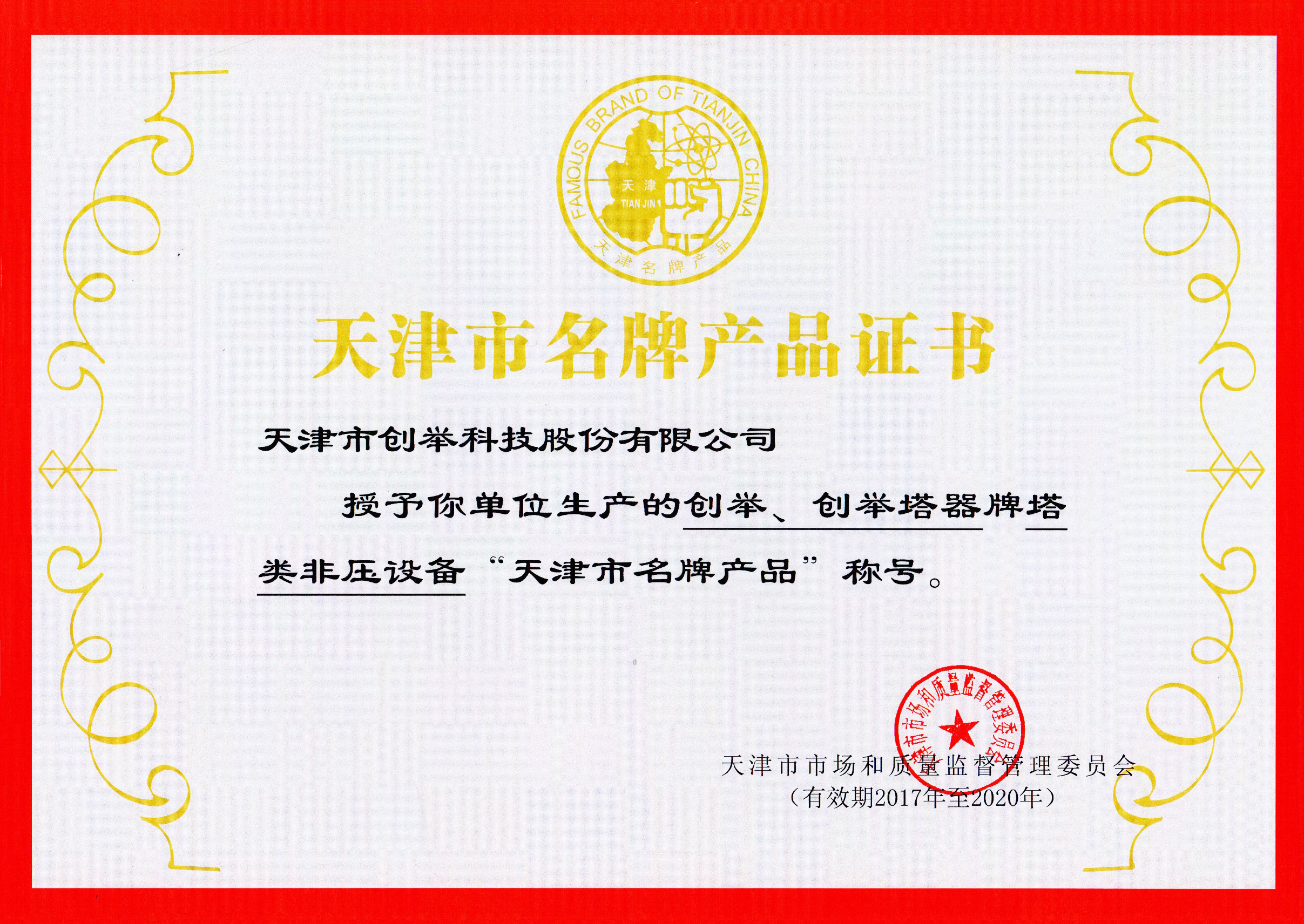2014年 “創(chuàng)舉塔器”獲得天津市名牌產(chǎn)品稱號(hào)。