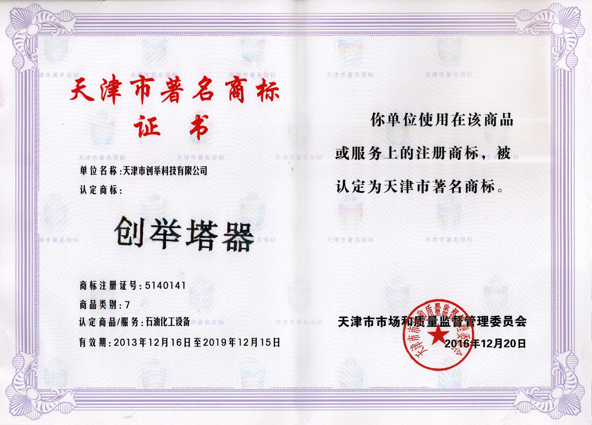 2013年 “創(chuàng)舉塔器”獲得天津市著名商標(biāo)稱號(hào)。