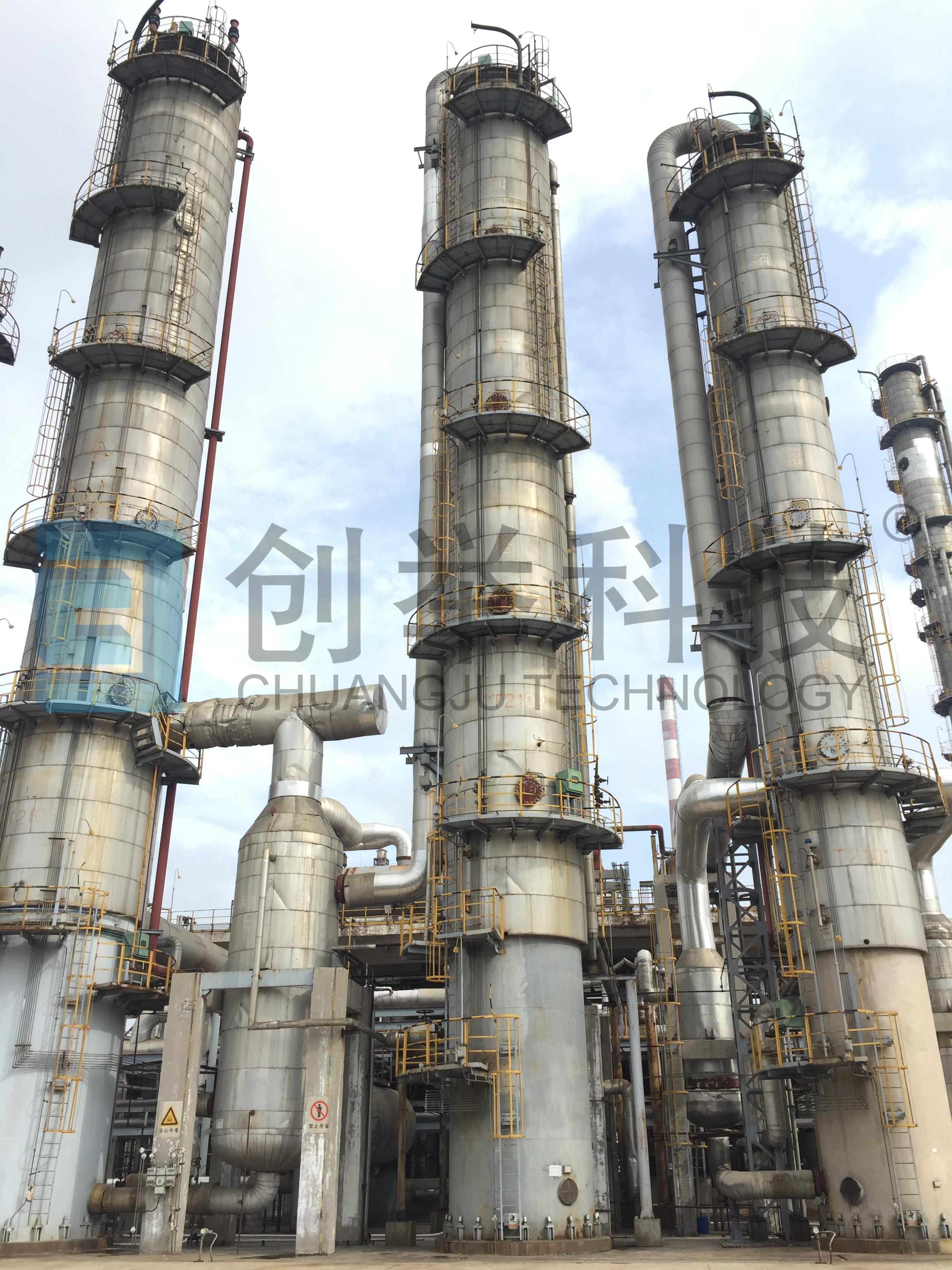 甲醇精餾多為兩塔和三塔流程,CJ系列高效噴射態(tài)塔板的應用不僅大大降低了塔徑和塔高,相對于浮閥塔板,生產(chǎn)能力可提高50~100%,蒸汽消耗顯著降低,兩塔精餾蒸汽消耗<1.5噸/噸精甲醇,三塔精餾蒸汽消耗<1.1噸/噸精甲醇。已成功應用于全國第二套、第三套焦爐煤氣制甲醇裝置——建滔12萬噸/年、滕州盛隆10萬噸/年的甲醇精餾塔,產(chǎn)品達到美國AA級產(chǎn)品標準。