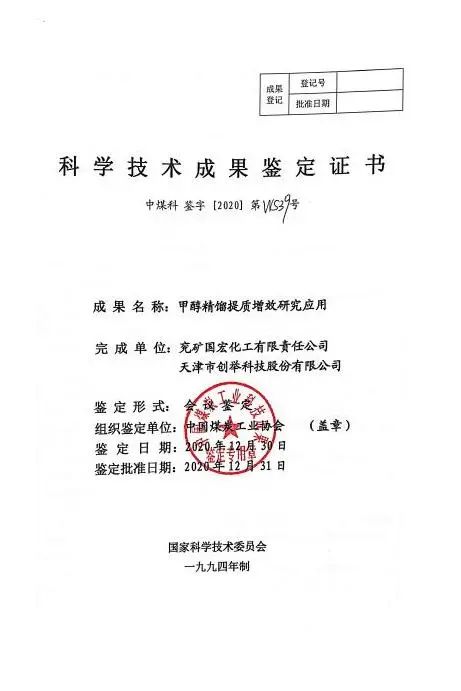 2020年底,中國煤炭工業(yè)協(xié)會組織有關(guān)專家,對國宏公司及創(chuàng)舉科技共同申報的“甲醇精餾提質(zhì)增效研究應(yīng)用”技術(shù)進(jìn)行科學(xué)技術(shù)成果鑒定。經(jīng)專家鑒定,該項技術(shù)成果達(dá)到“