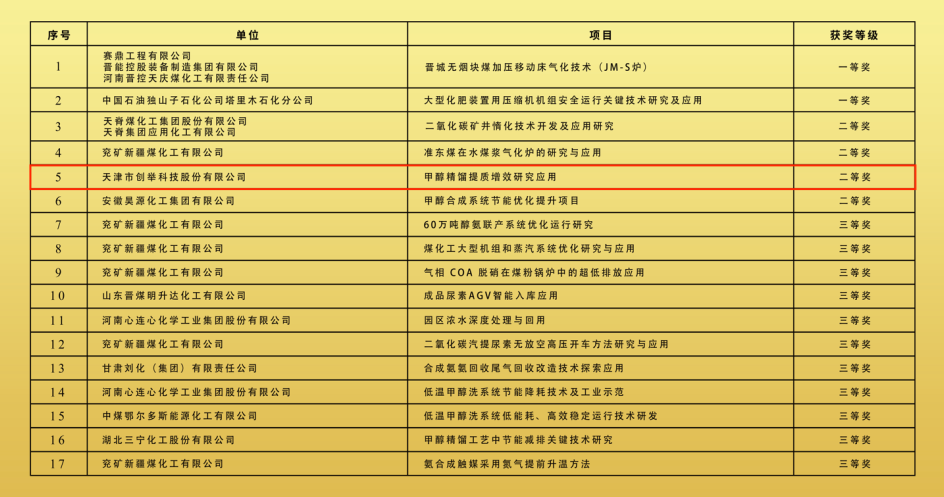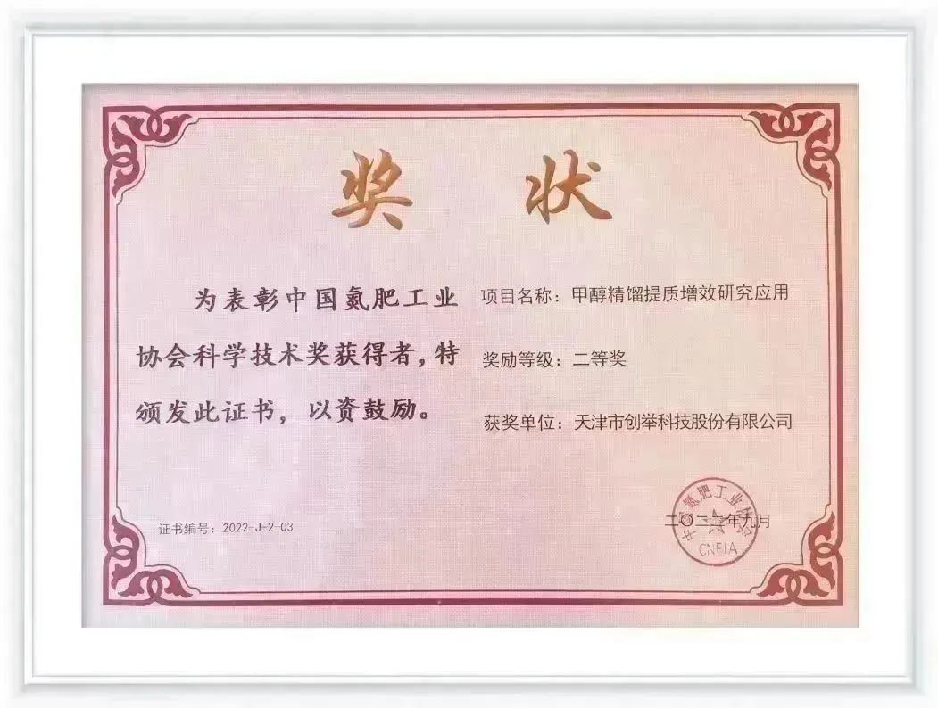 會(huì)上,中國氮肥工業(yè)協(xié)會(huì)對(duì)科技創(chuàng)新方面做出突出貢獻(xiàn)的企業(yè)進(jìn)行了表彰。天津市創(chuàng)舉科技股份有限公司(以下簡稱“創(chuàng)舉科技”)申報(bào)的“甲醇精餾提質(zhì)增效研究應(yīng)用”項(xiàng)目,榮獲中國氮肥工業(yè)協(xié)會(huì)科學(xué)技術(shù)獎(jiǎng)二等獎(jiǎng)。