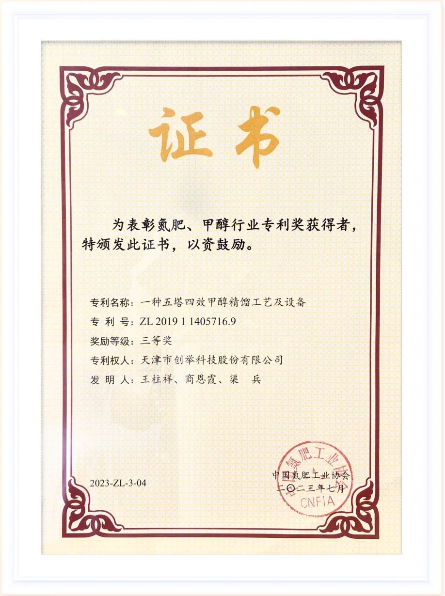 創(chuàng)舉科技自主研發(fā)的“一種甲醇五塔四效精餾工藝及設(shè)備”發(fā)明專利榮獲“2022年度氮肥、甲醇行業(yè)專利獎三等獎”。該專利是一種節(jié)能型甲醇精餾工藝,在運行過程中減少了新鮮蒸汽和循環(huán)冷卻水的消耗量,同時增強塔釜液循環(huán)強度,從而達到高效節(jié)能的效果。