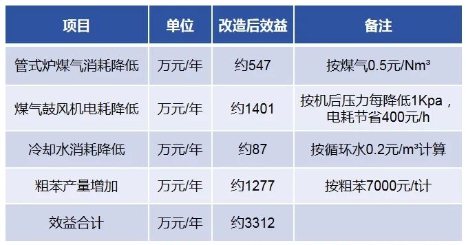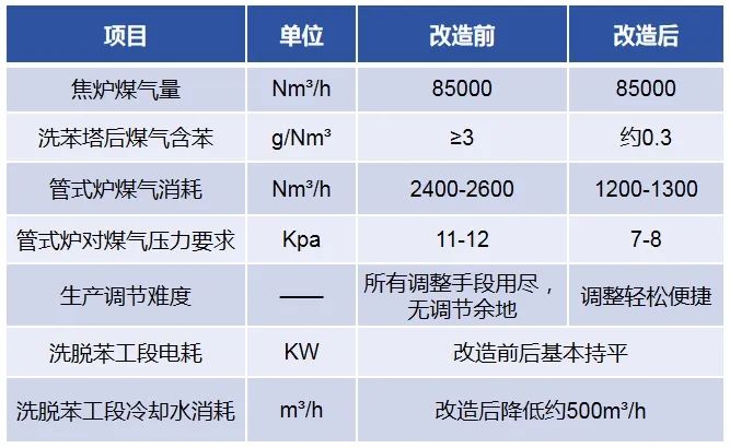 改造后貧油加熱、洗油再生控制更容易,同時(shí)可以改善循環(huán)洗油質(zhì)量,以后如果使用中壓蒸汽加熱,效果會(huì)更好。