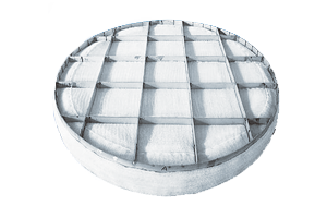 H型除沫器具有除沫效率高、抗堵塞的特點(diǎn)。通過(guò)H型和V型折流板的巧妙組合,使得氣液在并流過(guò)程中兩次改變流動(dòng)方向,并且發(fā)生液滴的并聚,并聚下降的液滴落到導(dǎo)流槽后,通過(guò)自身重力流到塔盤(pán)上。這種組合既克服了除沫效率不高的缺點(diǎn),又對(duì)含有固體懸浮顆粒的易堵物系有較好的抗堵性能。除沫段的壓力降一般在50-200Pa之間,對(duì)阻力降比較苛刻的塔是十分適合的。另外該除沫器設(shè)有上下雙管沖洗裝置,可定期對(duì)除沫器上積存的固體懸浮物進(jìn)行沖洗,避免堵塞,操作十分方便。