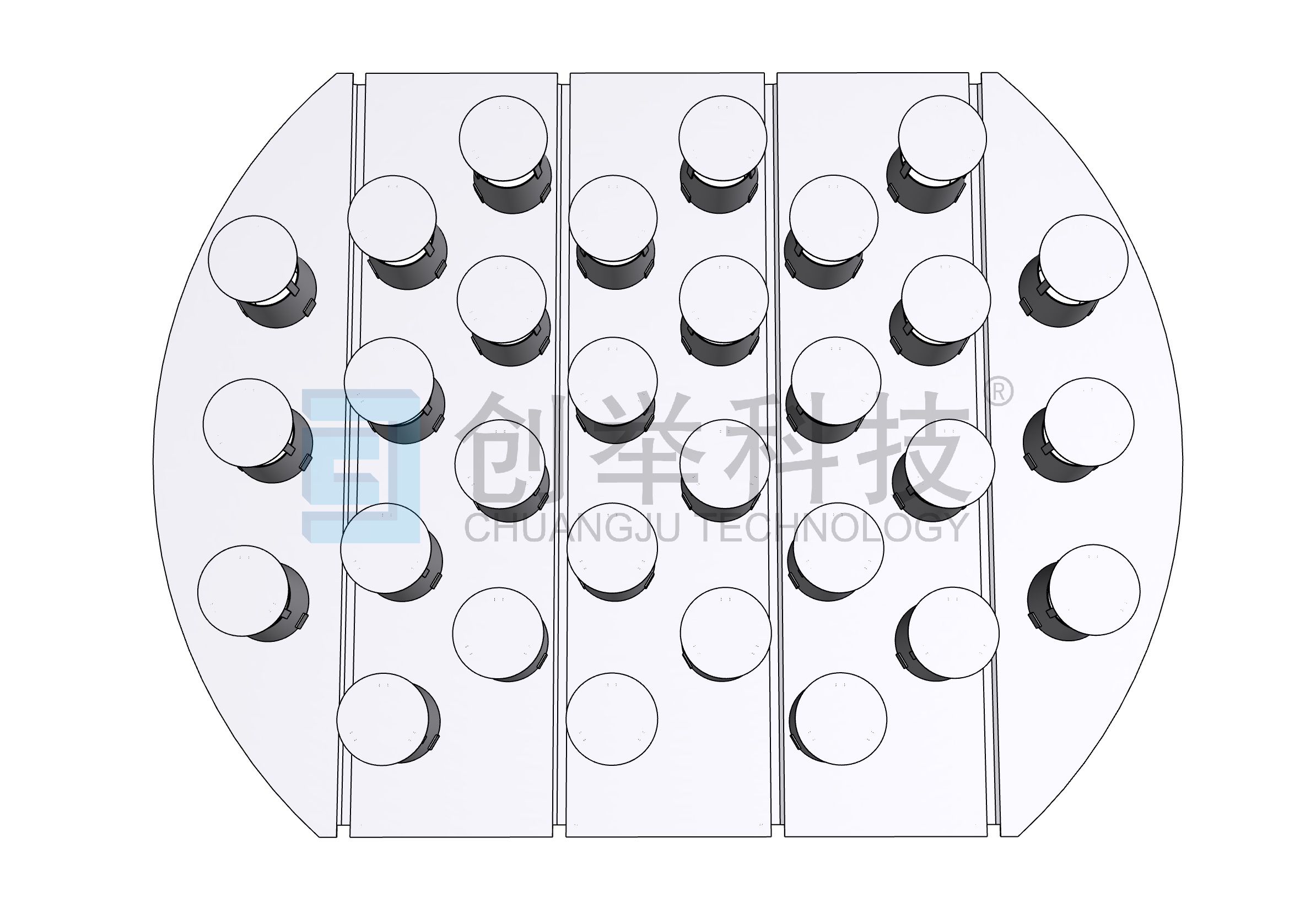 圓蓋將液體向四周分散,塔板上設(shè)置捕集裝置,可有效的降低霧沫夾帶,實現(xiàn)無返混。